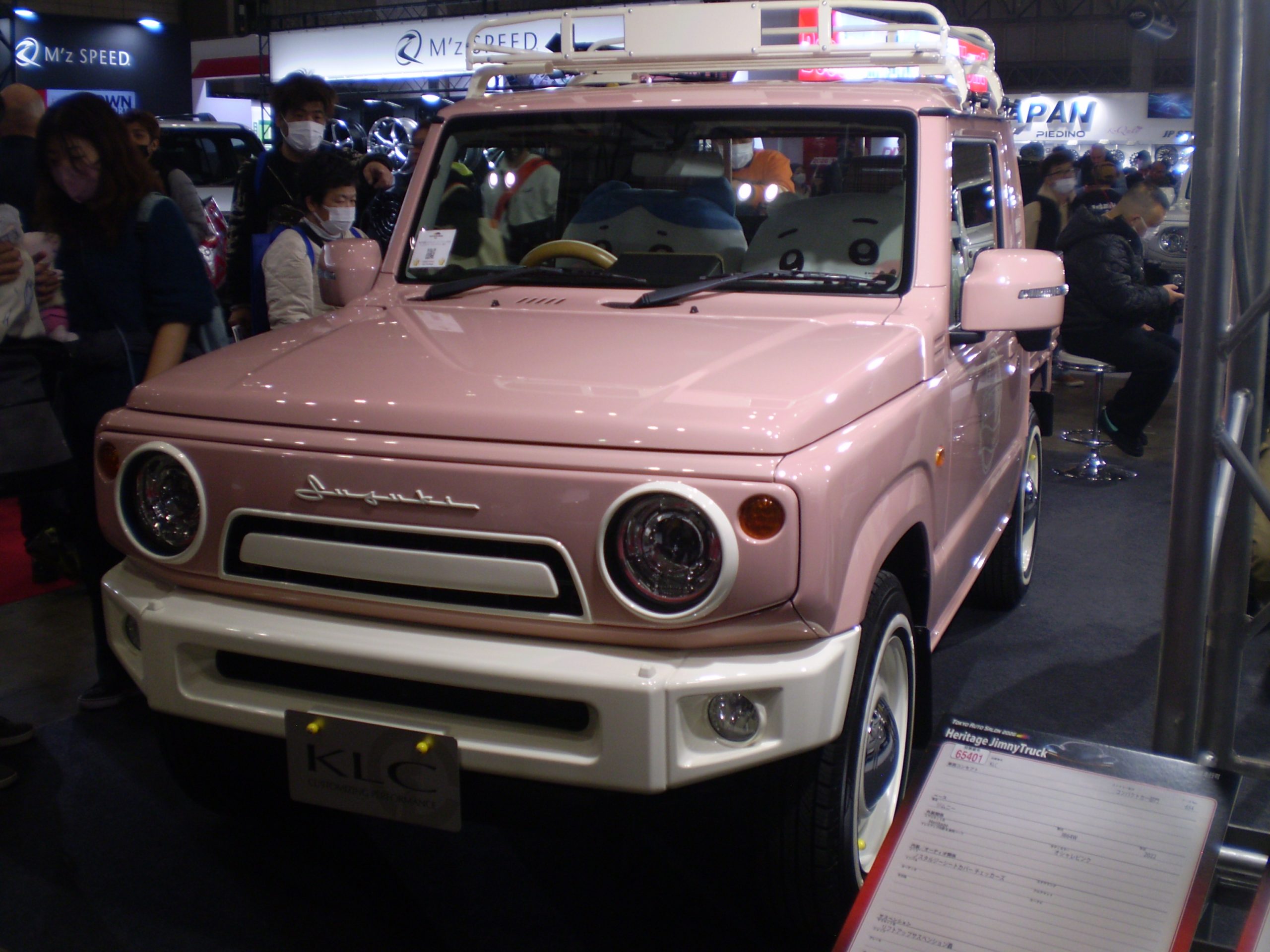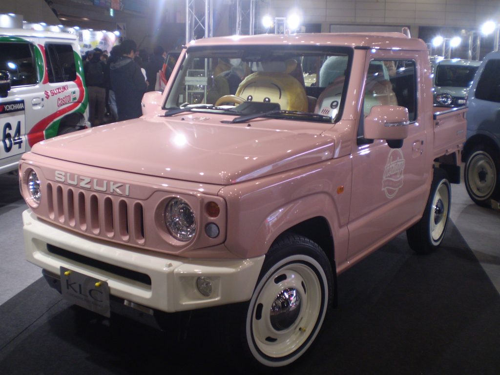 こちらはピンクに全塗装したJB64型ジムニー。可愛らしい外見です。