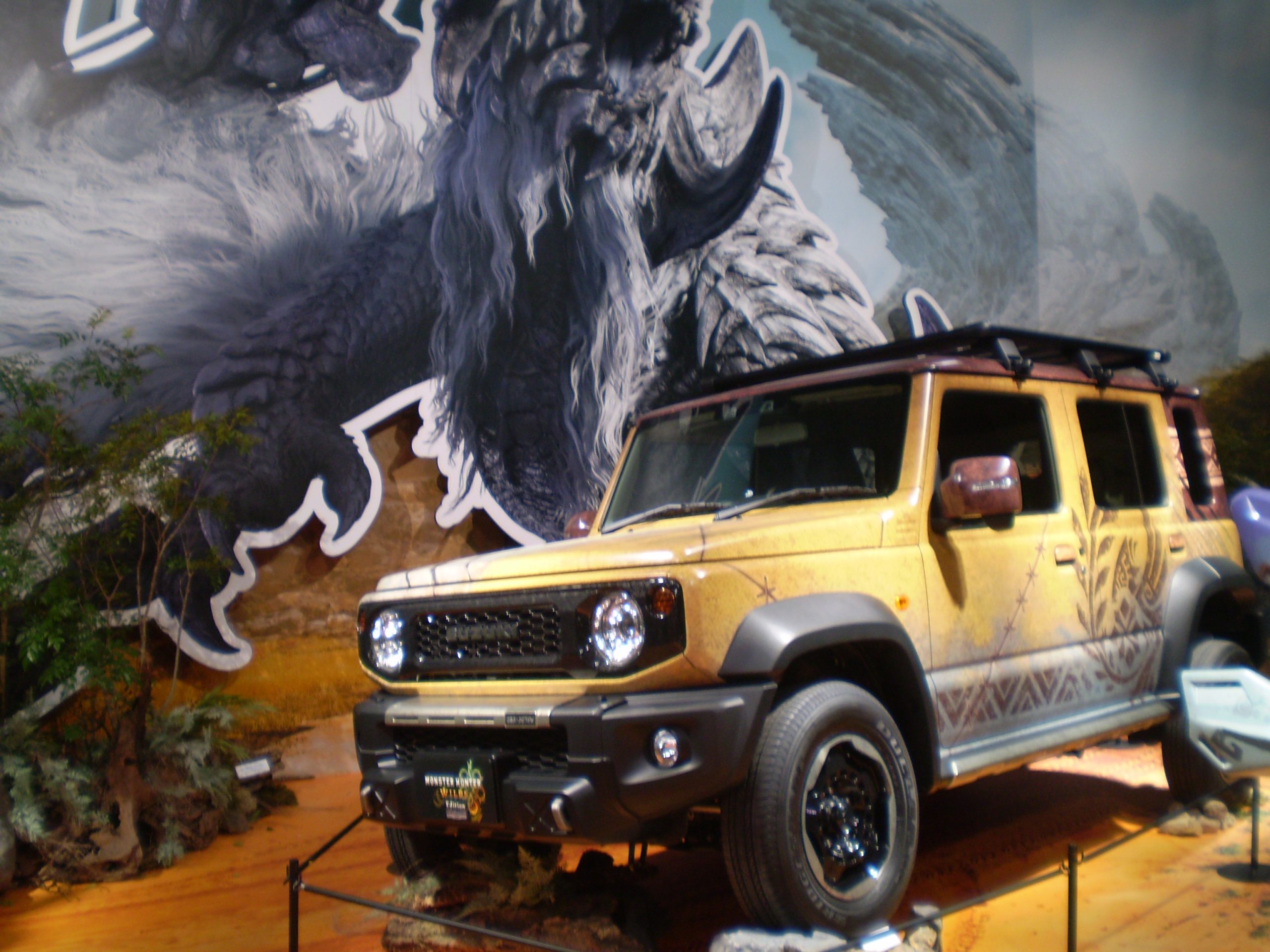 モンスターハンターの世界観を醸し出すジムニーノマドが展示されてました。後ろの飛竜といい雰囲気を出してます♪